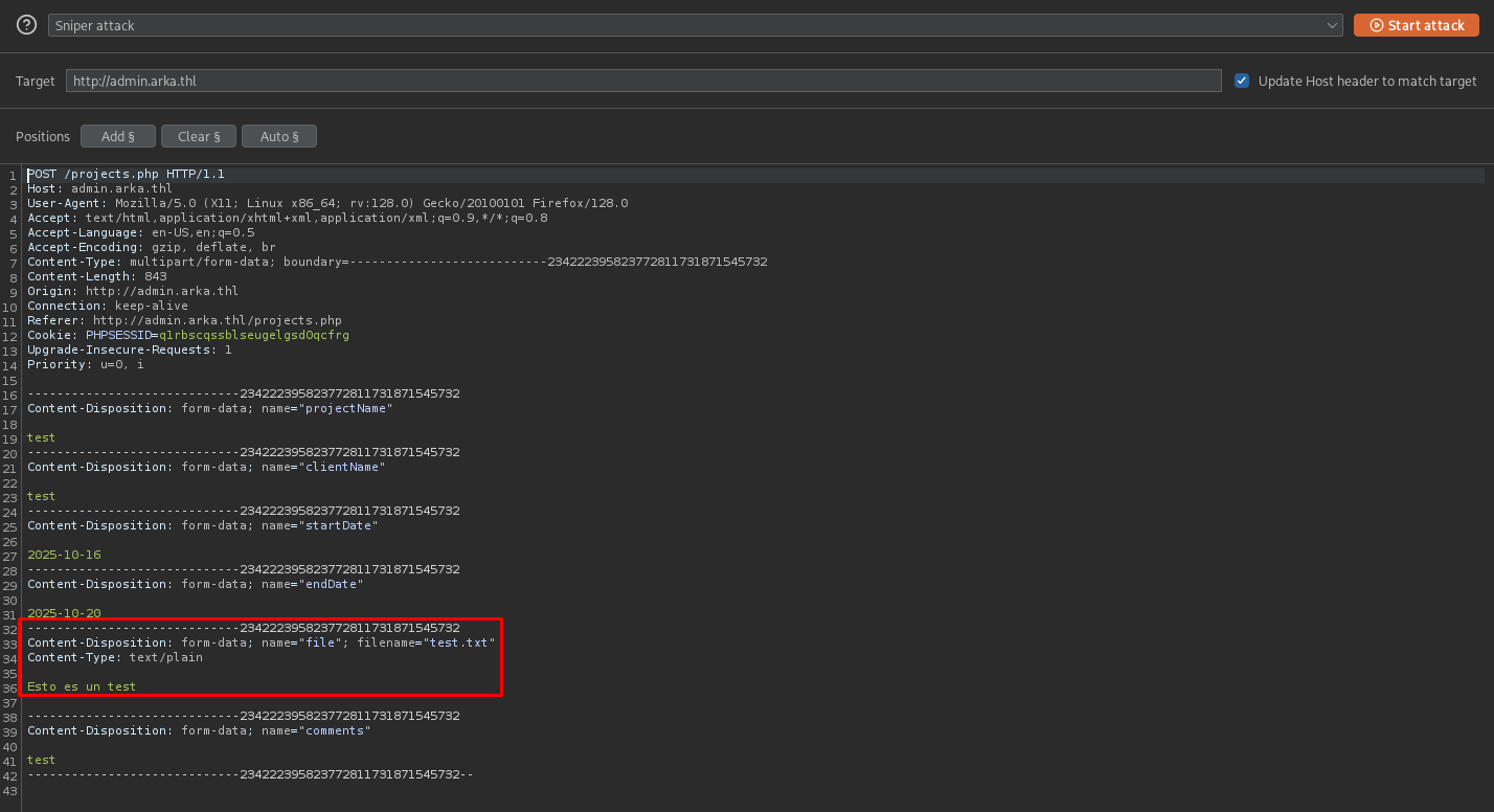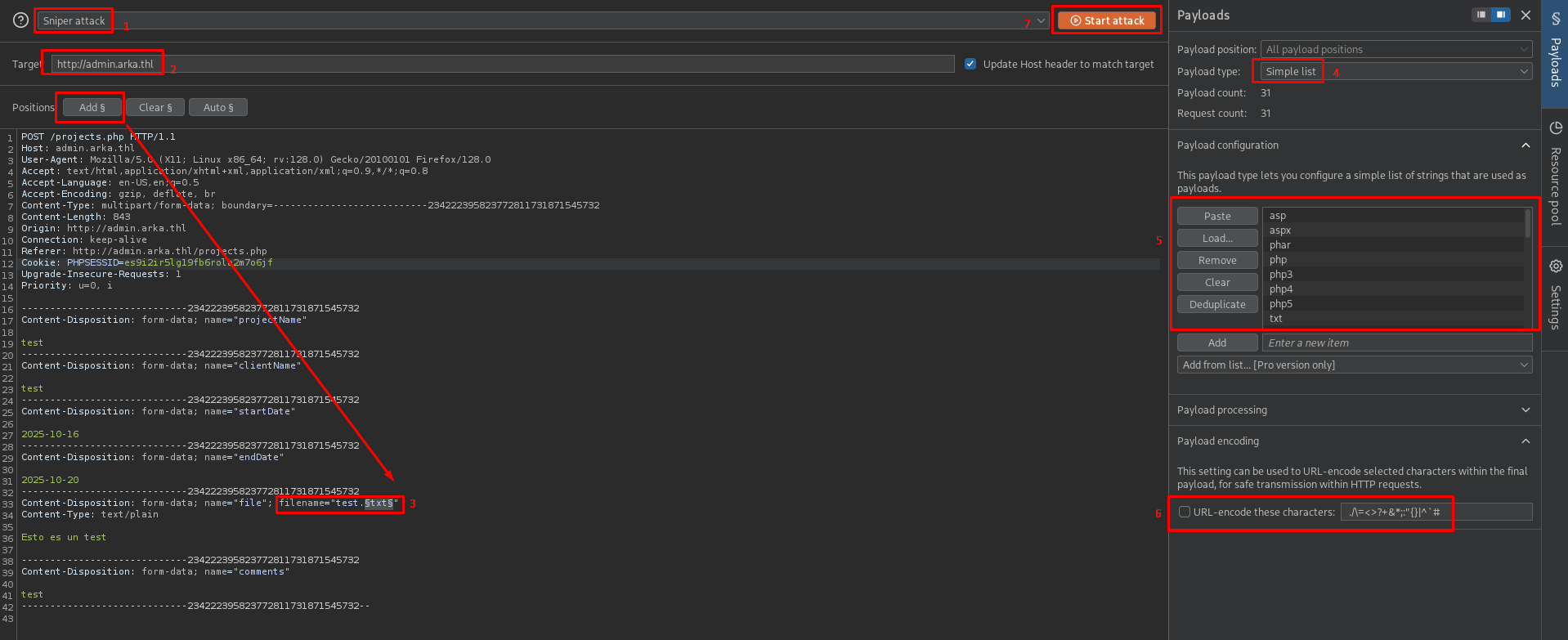 - Aplicando Sniper Attack con BurpSuite para Identificar Archivos Aceptados en Página Web de Administrador