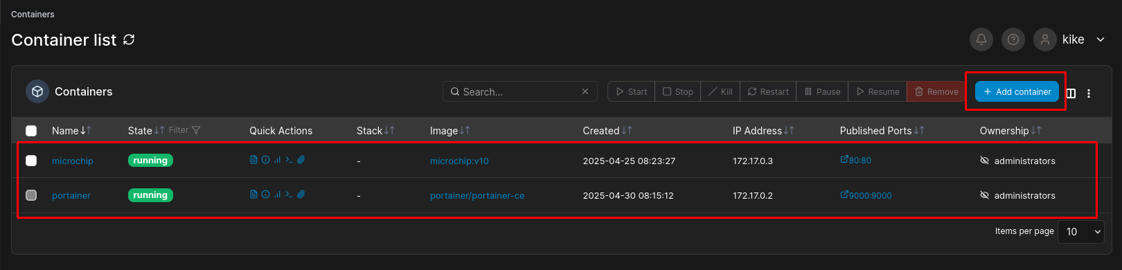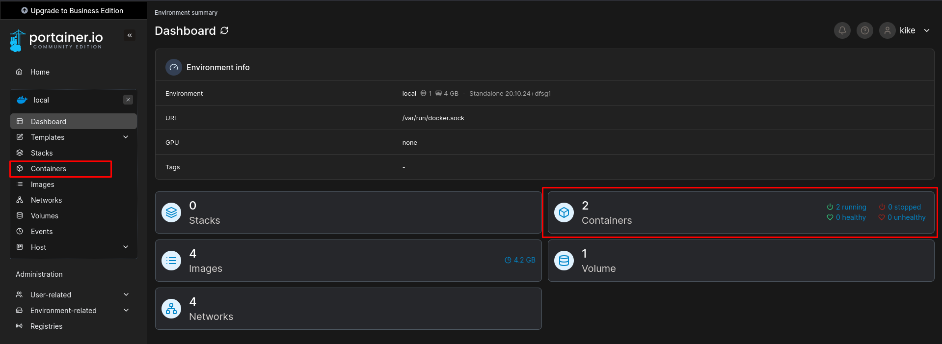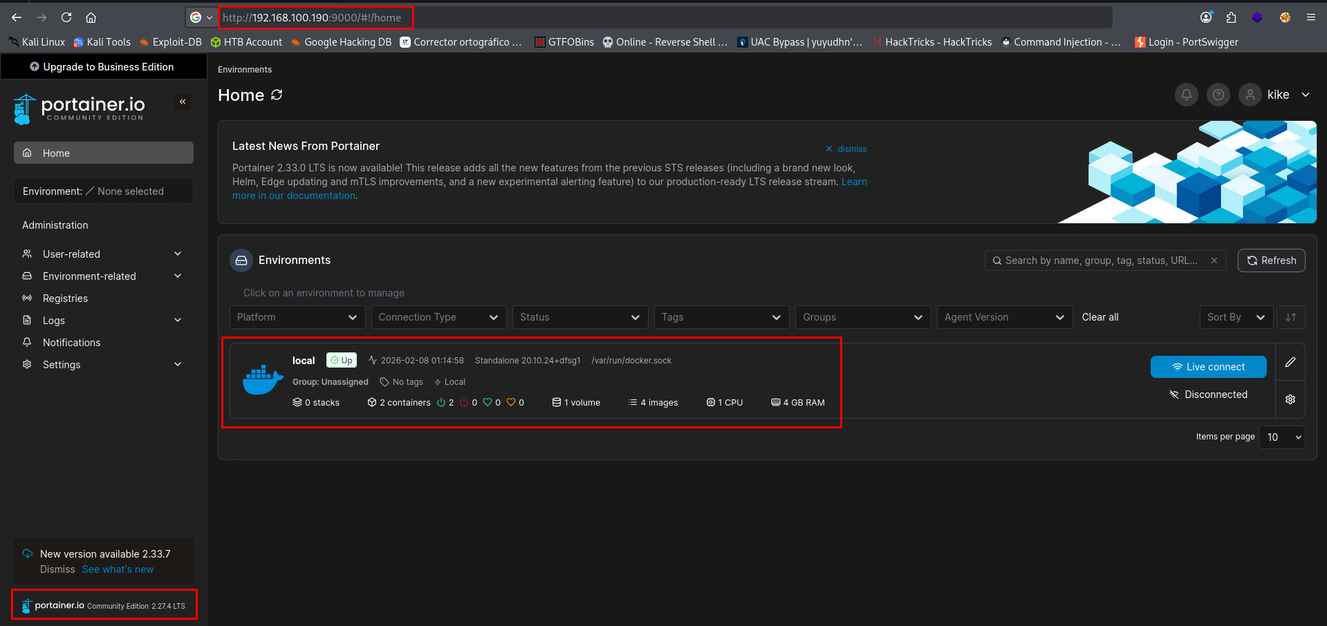 Dentro de la máquina víctima no hay mucho que podamos hacer; sin embargo, probando las mismas credenciales del usuario kike, logramos ganar acceso al portal de Portainer: