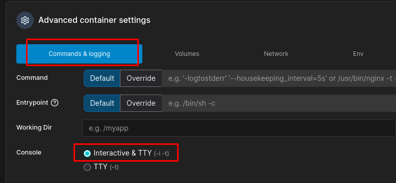 Bajando a la sección avanzada, escogemos la opción Interactive & TTY: