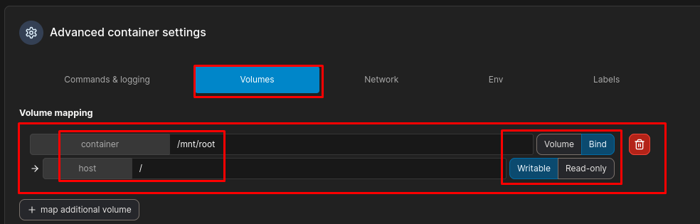 Ahí mismo, cambiamos a la sección Volumes e indicamos dónde se guardará la montura (importante usar la opción Bind), y le indicamos el path que se tomará para crear la montura, siendo la raíz de la máquina víctima: