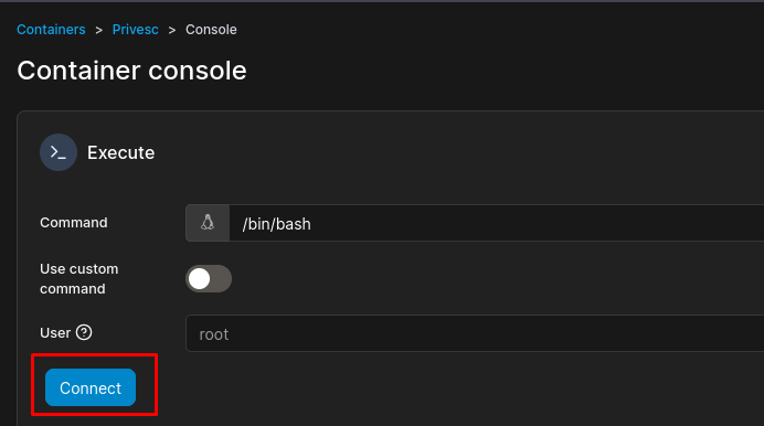 Entra ahí y en la sección Container Status, verás una opción que es para obtener una consola interactiva; dale clic y activa la consola dándole al botón Connect: