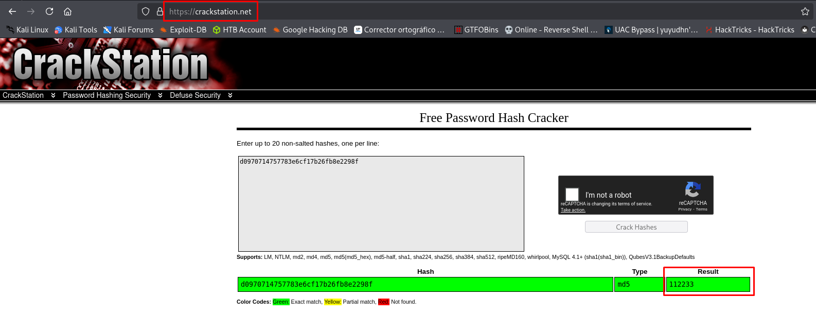 Analizando la contraseña, vemos que tiene la sintaxis de un hash MD5, por lo que podemos crackearlo con JohnTheRipper o con la página web Crackstation.