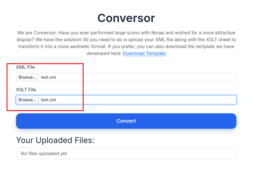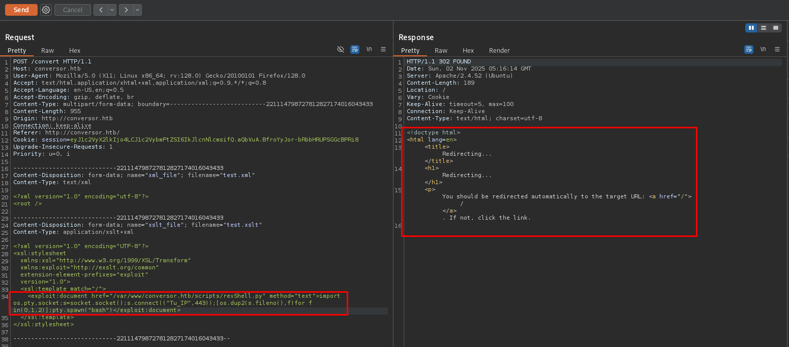 Esta fue una máquina sencilla, pero que te puedes perder si no tienes cuidado. Después de analizar los escaneos, vemos que la página web activa en el puerto 80, está usando Virtual Hosting, pues el escaneo nos muestra un dominio. Registramos el dominio en el /etc/hosts y visitamos la página. Resulta ser un login, que nos deja registrarnos como un nuevo usuario. Entrando al login, vemos un dashboard en donde podemos hacer conversiones de archivos XML usando archivos XSLT para generar un archivo HTML. También, vemos que en la sección About, nos comparten el proyecto completo, que después de descargarlo y analizarlo, vemos que es vulnerable a inyecciones XSLT. Aplicamos algunas inyecciones para inyectar un script de Python que ejecuta una Reverse Shell, con la que ganamos acceso principal a la máquina víctima. Dentro, enumeramos la base de datos de la página web, utilizando el comando sqlite3, descubriendo la contraseña de un usuario como un hash MD5, que crackeamos con JohnTheRipper y nos conectamos a la máquina vía SSH. Ya como el nuevo usuario, vemos que puede usar la herramienta needrestart como Root. Investigando la herramienta, resulta que puede leer y ejecutar archivos de texto, si los escribimos con la misma sintaxis que usamos con la librería OS dé Python para ejecutar comandos. Creamos un archivo de texto con una instrucción que nos permitió obtener una shell de Root, logrando escalar privilegios.